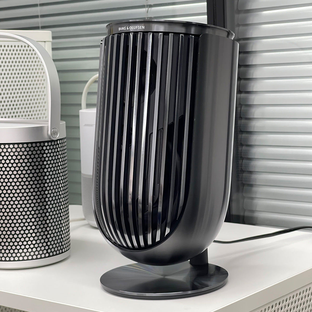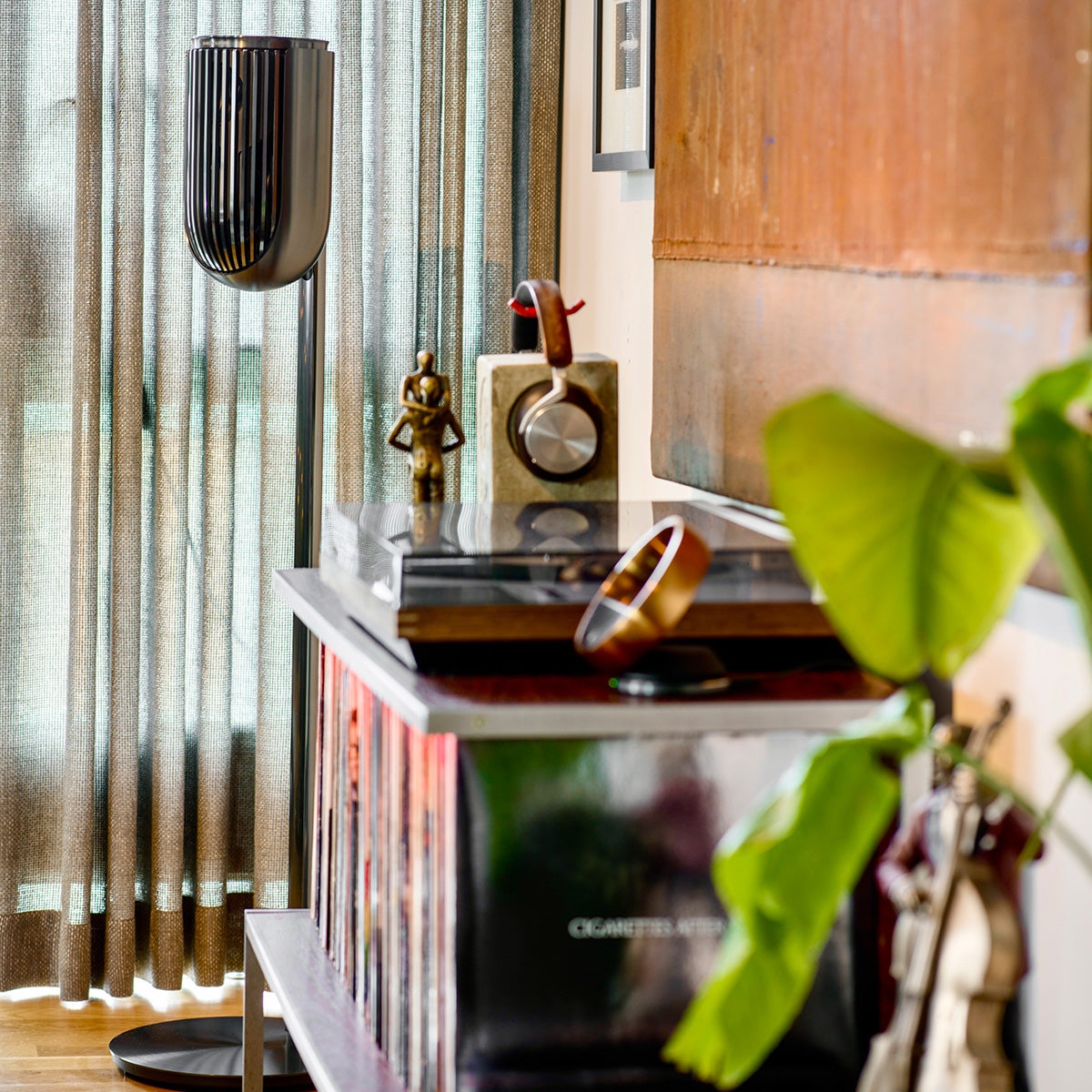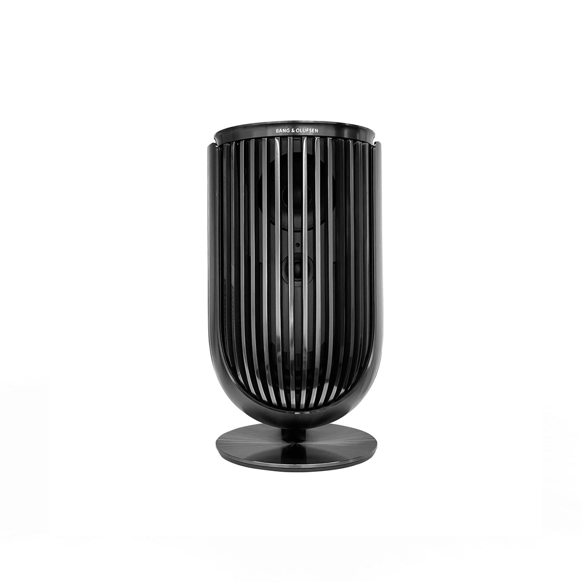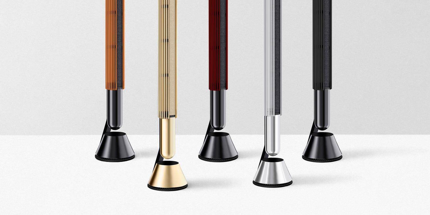 Satin-matte, cabinet-matched aluminium that keeps the tall columns calm and refined; combine with BeoLab 8 aluminium covers for light-catching surround to balance the polished centre.