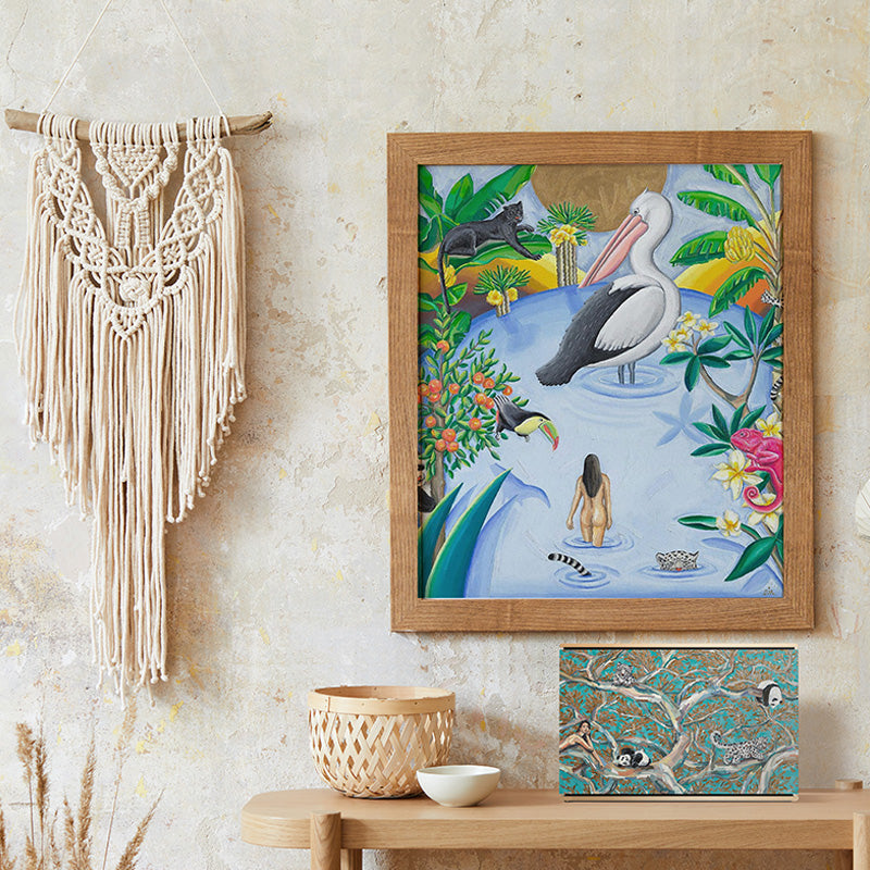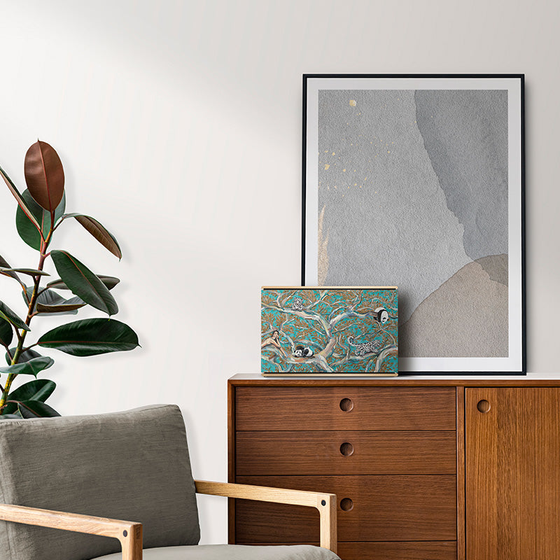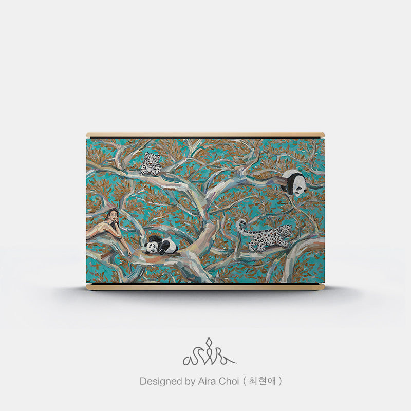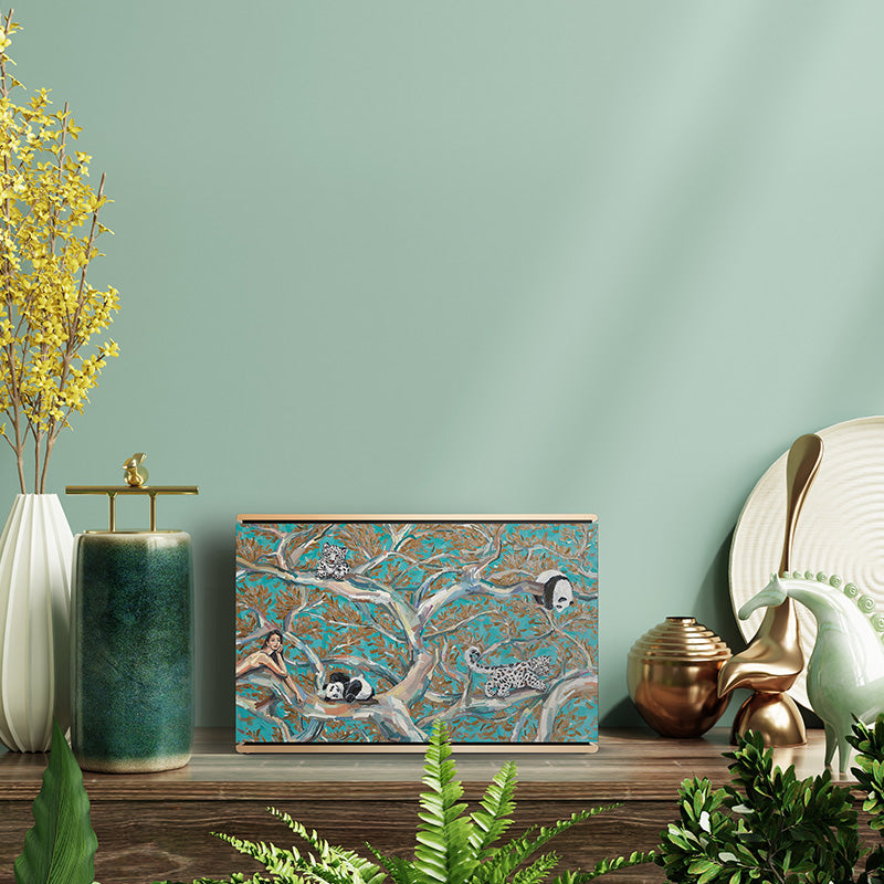 The Tree of Love features a vibrant depiction of eight baby snow leopards and pandas resting in a grand tree of paradise, symbolizing good luck and harmony. As part of Aira Choi’s “The Shambhala” collection, this design invites you to experience a magical world filled with beauty and fortune, bringing both elegance and artistry to your space.