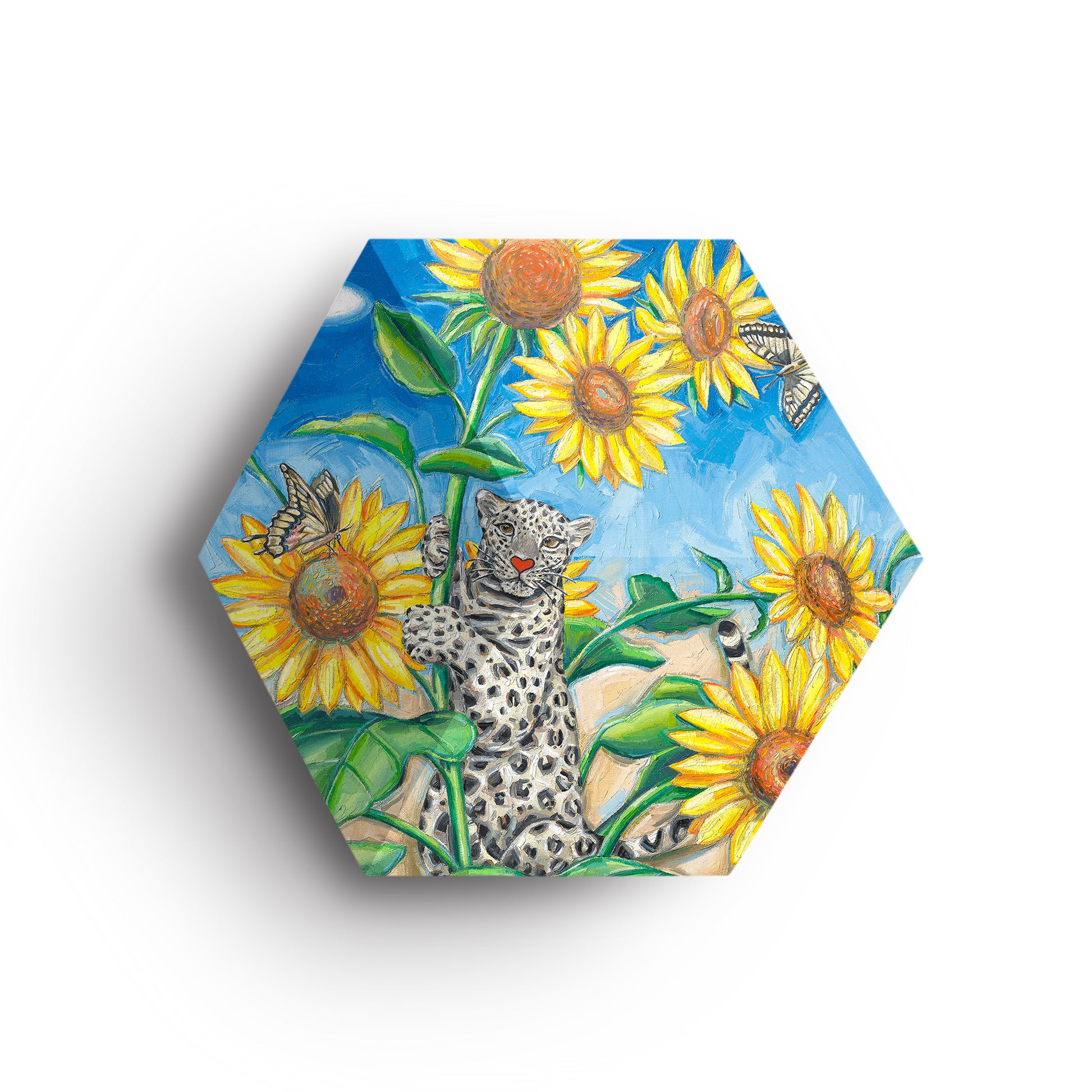 "A young white leopard is amazed to see a tiger butterfly that resembles him in a sunflower field."